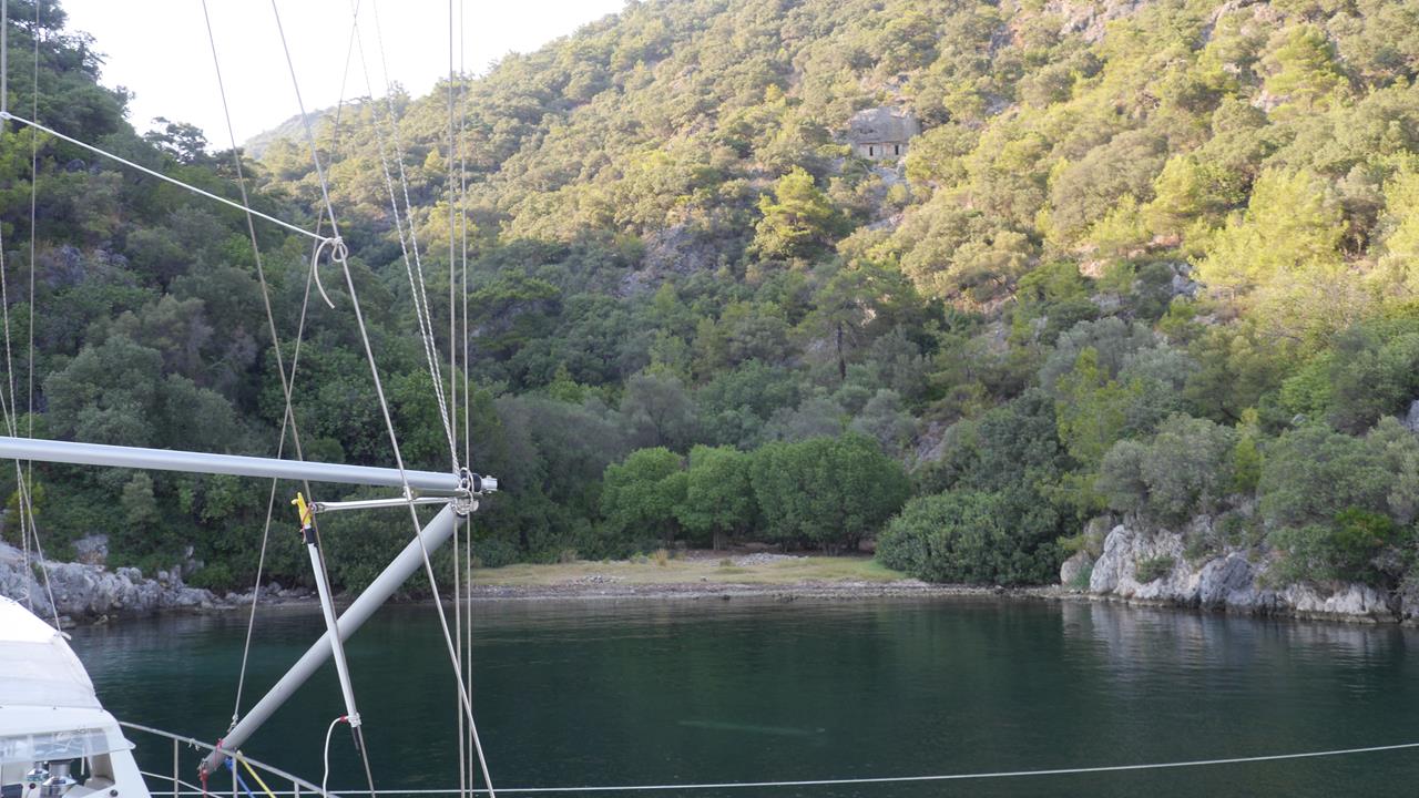 Nästa hamn återigen efter plattläns i dryga 10 m/s vind vart Tomb Bay i området Skopea Limani, en underbar bay med massor med skyddade och vackra gröna vikar och dramatiska berg. Jag kan verkligen rekommendera att segla här. Man kan hyra segelbåt i Göcek ett litet lokalt seglar/båt Mecka framförallt för de med gott om pengar. Tomb Bay har vi besökt ett flertal gånger, men det är fortfarande lika vackert i våra ögon, vi stannade i två nätter och badade i det badkarsvarma vattnet.