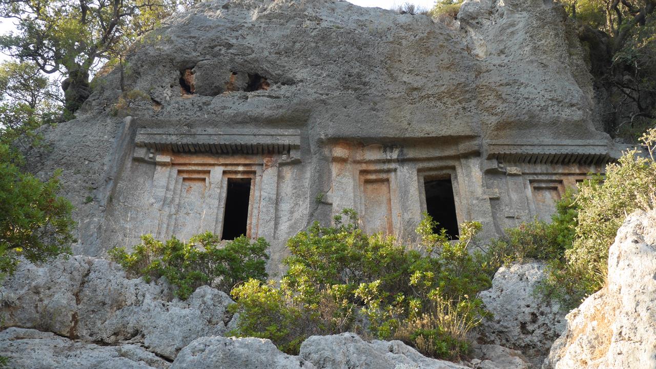 Tomb Bay har fått sitt namn ifrån de inhuggna Lykisiska klipp gravarna som är uthuggna direkt i berget några 100 år BC, (https://sv.wikipedia.org/wiki/Lykien)