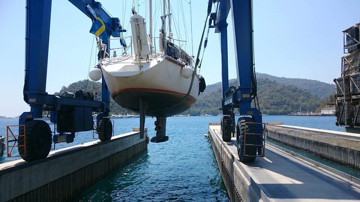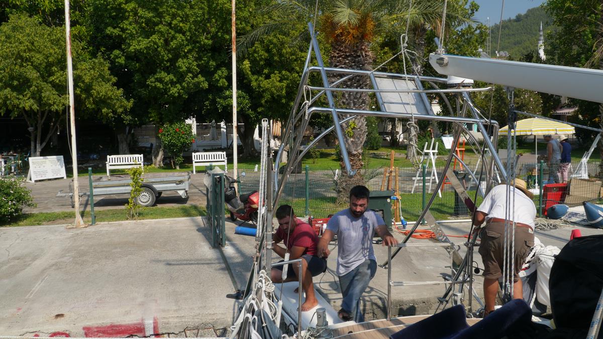 Emek Marin i Göcek är generalagent för Amel i Turkiet och tar dessutom hand om och utrustar tämligen många Ameller då de har haft gott rykte om att göra bra jobb till hyggliga priser. Det har gjort att de fått betydligt flera kunder det senaste året fler än de har klarat av att hantera, så det var nu två båtar som fått vända om ifrån sin långsegling för att reklamera sådant som blivit felaktigt, och det visade sig att det var en hel del som inte funkade som det skulle. Detta har gjort oss tveksamma hur vi skall göra med vår båt, dock hade vi redan beslutat att de skulle få montera en targabåge med solceller på vår båt. Och det gjordes mer eller mindre på utsatt tid, man måste dock vara där och bevaka jobbet så att det blir korrekt utfört. Tyvärr så hade de inte kajplats för vår båt vid den kommunala marinan som de normalt utnyttjar, eftersom de fått in de två båtarna som hade problem. Så vi fick flytta oss ett flertal gånger och hamnkaptenen i den kommunala marinan blev lite förgrymmad på oss.