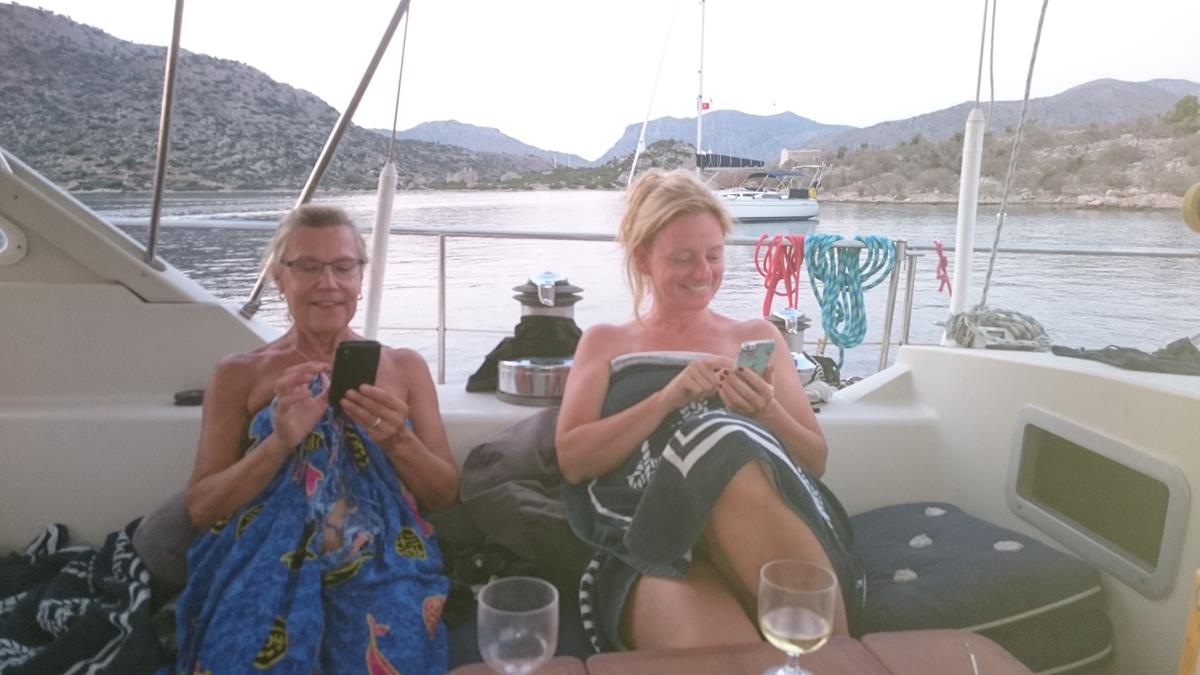 Damerna helt försjunka i sina mobiltelefoner inget långseglar virke här inte, i sanningens namn så missar jag inget tillfälle att uppdatera mig via internet om vad som händer i världen heller