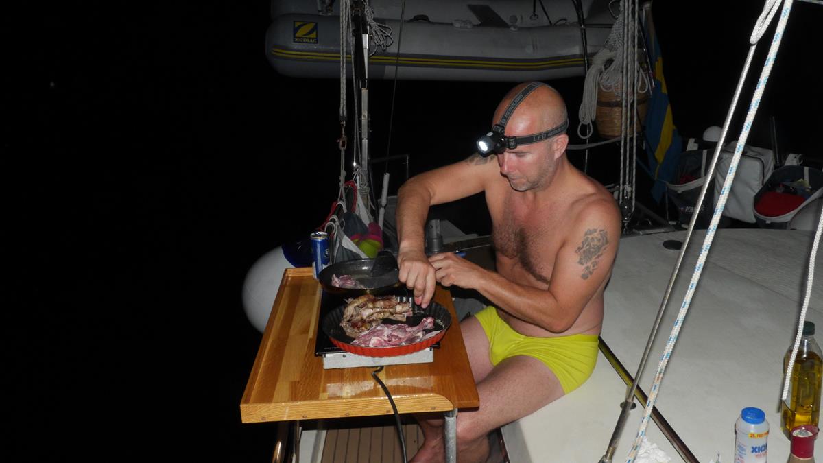 Niklas brassar käk på akterdäck (för varmt inne), enda gången vi körde elverket efter installation av solcellerna