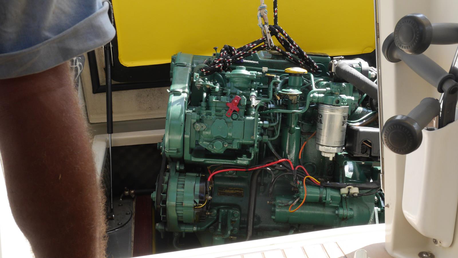 Jag hade tänkt byta motorkuddar själv, men det är jag väldigt glad att jag sköt till sen, trodde inte att det var så vårt, men efter att läst på forumet för Amelbåtar så insåg jag att det var nog lite komplicerat, man behöver lyfta motorn vilket de gjorde galant med mesanstagseglets fall och några gubbar som baxade upp den på sittbrunsbänken. Det visade sig att flexikopplingen behövde bytas. Vi blir nog här några veckor, bl.a. beroende på att deras planering inte är den bästa och att alla delar inte finns i lager så vi väntar på leverans, dessutom så börjar en religiös helg idag.