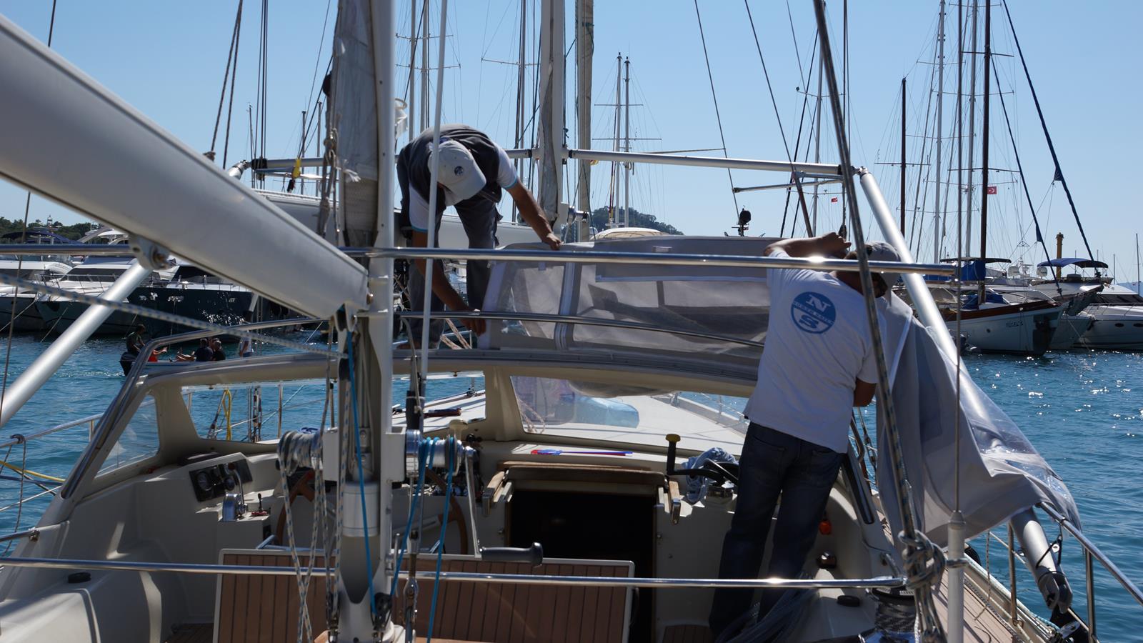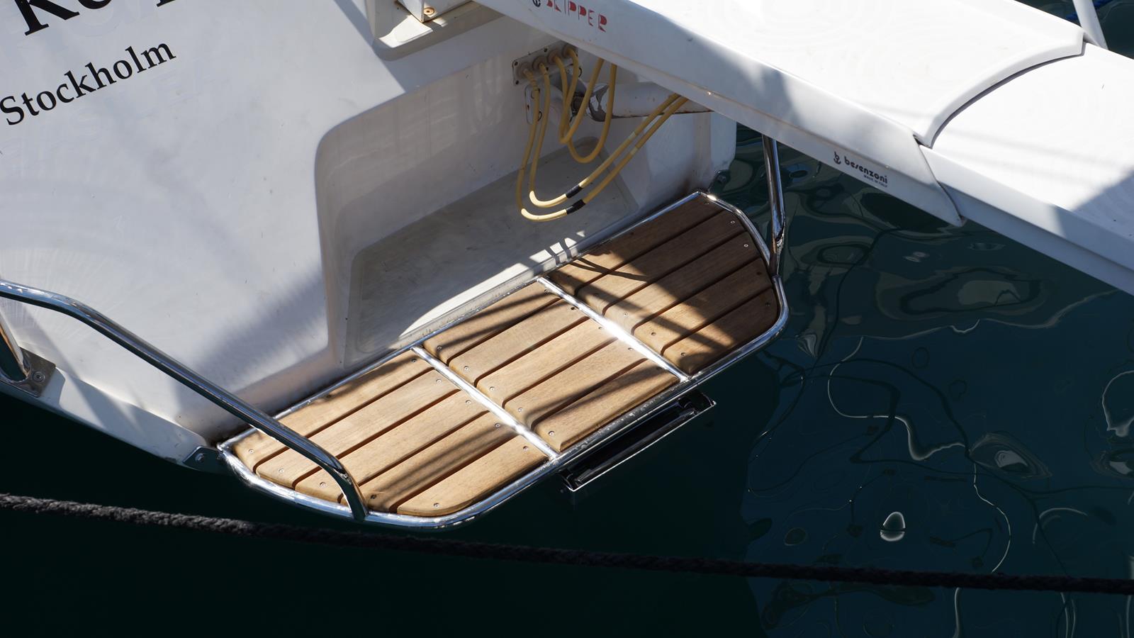 Har man ”local warming” så behöver man bada och det ofta, på en Amel så har man en separat badstege man monterar på sidan av båten då man skall bada och därefter skall den förvaras utmed sidan av relingen, inte speciellt praktiskt, moderna båtar har betydligt smartare lösningar. Vanligtvis så söker man då på Amelforumet som är mycket aktivt, det brukar alltid vara någon som har löst de problem som uppstår och hittils har så varit fallet med våra problem och potentiella förbättringar. Men nu gick vi bet, det var ingen som hade tänkt på detta eller funnit anledning att ändra på detta sätt att ta sig ur vattnet upp i båten. Hemma i Sverige så är det mängder med båtar som har monterat en badbrygga för ändamålet, och det ville vi ha. Men Emek Marin som jobbar med våran båt trodde inte alls på den lösningen och inte ”smeden” heller som gjort mängder med lösningar i rostfritt till andra Ameller. Vi insisterade dock och efter att jag gjort en modell i wellpapp så gick de med på att tillverka en badplattform med tillhörande stege och nedan ser ni resultatet. Vi är mycket nöjda och det är Emek Marin också, de kom ner och fotade skapelsen och de kommer säkert marknadsföra den som ett nytt tillbehör. Alla parter nöjda.