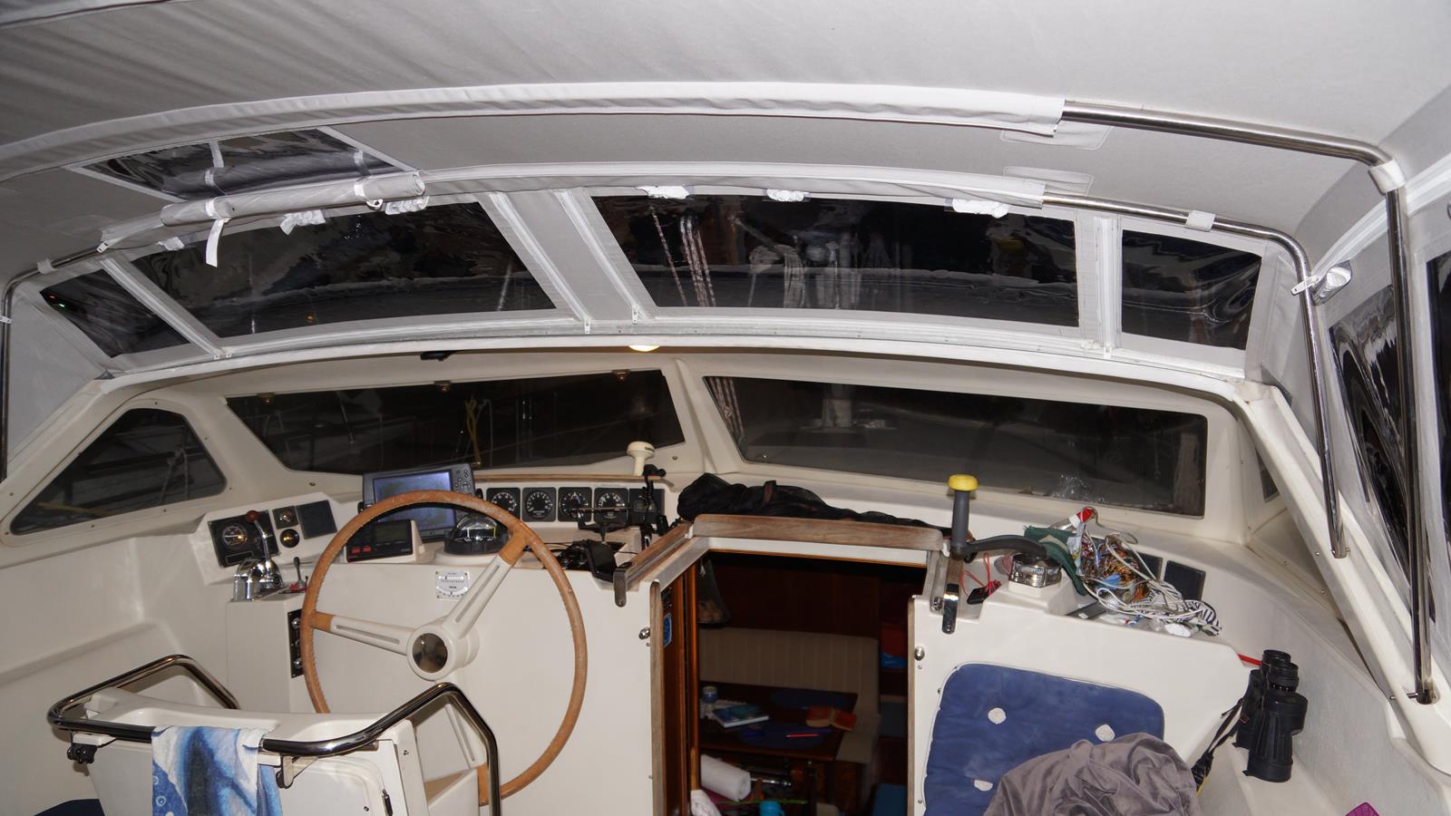 Solskydd av finmaskigt nät som håller solen ut men släpper igenom den svalkande vinden kan man sätta runt om. Så för er som funderar på att segla på värmen så mot ett smärre konsultarvode kan jag hjälpa er att designa det perfekta kapellet till er båt.