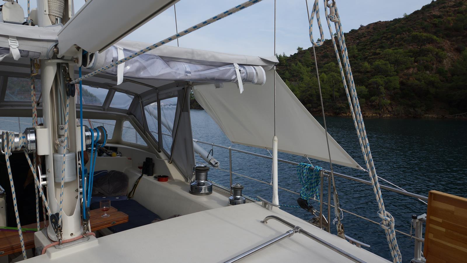Som såg ut så här, tämligen låg och begränsad sikt framåt och trots att den var vit så fungerade den som ett växthus, det blev fruktansvärt varmt under den så trots att den gav skugga så var det många gånger svalare i solen uppe på däck där det också fläktade, så vi drabbades verkligen av ”local warming”. Vi kände att det är högprioriterat att göra något åt detta, så genom att söka på Amelforumet och se vilka olika lösningar det fanns. Därefter skred vi till verket och beställd en helt ny Sprayhood med tillbehör såsom kapell etc.av en kapellmakare i Göcek, men först fick ”smeden” förlänga våra bågar ca 10 cm samt göra några nya ”bågar” över sittbrunnen