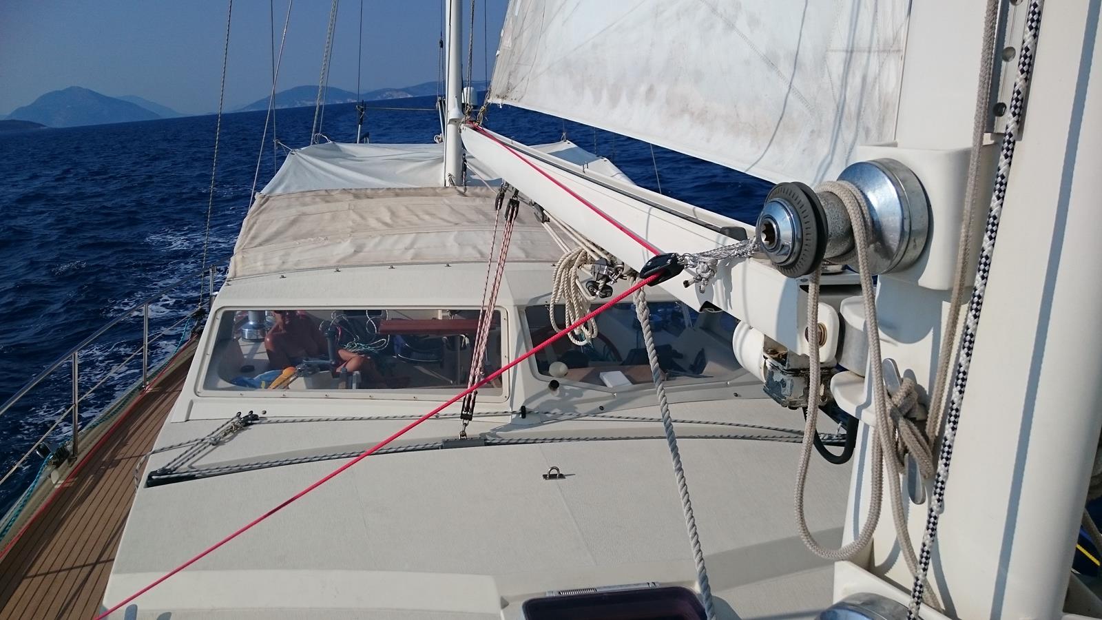 Kapten är nöjd, ty trots all ”high tec” utrustning så har jag saknat en Windex, men inte nu längre nu sitter det en i masttoppen (för er som inte seglar men läser detta ändå, så är en Windex en manick som analogt visar i toppen på masten hur vinden blåser, det finns ett instrument som med elektroners hjälp visar detsamma i sittbrunnen, men det är liksom inte samma sak), man är väl fortfarande lite bakåtsträvare