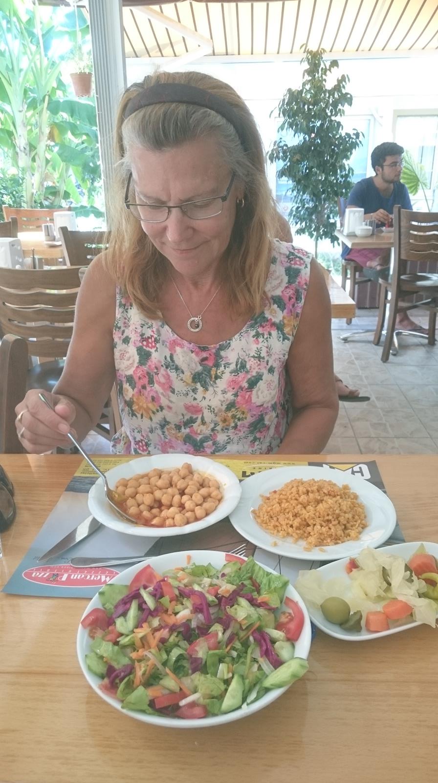Kerstin som är en ”Politiskt korrekt” dietist fick ju kompensera det följande dag med denna påvra lunch bestående av kikärter och bulgur, typ 100% fibrer, detta nedsköljt med ett glas vatten, Själv späkte jag mig denna gång med en Italiensk Pizza samt ett glas immande kall öl. Livet är inte alltid rättvist men denna gång stod jag på rätt sida skiljelinjen