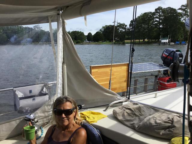 Unfortunately not very much wind and very cloudy so we mostly motored, to Upper River a part of York River. The most surprising issue was all crab pots that was everywhere, we sig sag to avoid catching any of the floats. Then in the river we saw small sticks here and there, what is that? is it shallow? Or some fixed fishing equipment? Later we learned that it is oyster beds. We found a sheltered place with the help of Active Captain a web based cruising information that works very well together with Garmin Blue chart and IPad, not on Android unfortunately, so we had to invest in a new IPad in Norfolk.