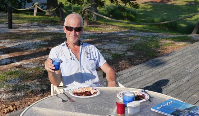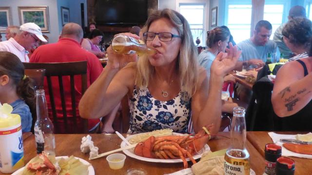 Kerstin enjoying the lobster together with the other boaters, US boaters are no party animals at all. Despite free beer and live music no one was remotely drunk and at nine o clock most people had gone home. That would never have happened in Sweden, by nine the noise level would have been very high and a few hours later most people who still could stand would be dancing.
