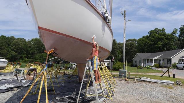 When the “grinders” took a break Kerstin did polish the water line and as high on the hull she could reach, Kerstin complained it was hard work, but nothing compared with the guys sanding.