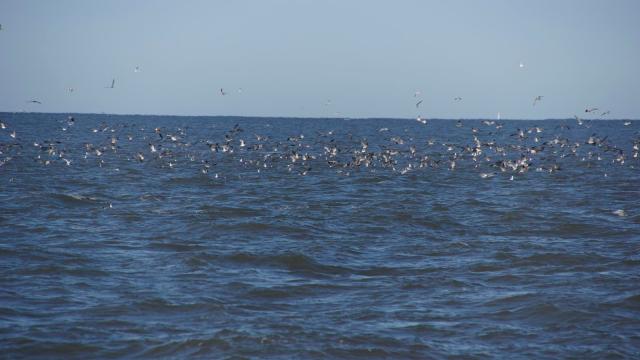 A lot of birds looking for food opportunities when big fishes hunting small fishes to the surface, life are tough escaping the big fish just to be eaten by the bird.