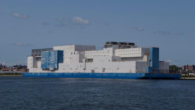 The transom has a “garage” for the tug that pushes the barge towards its destination.