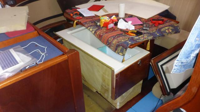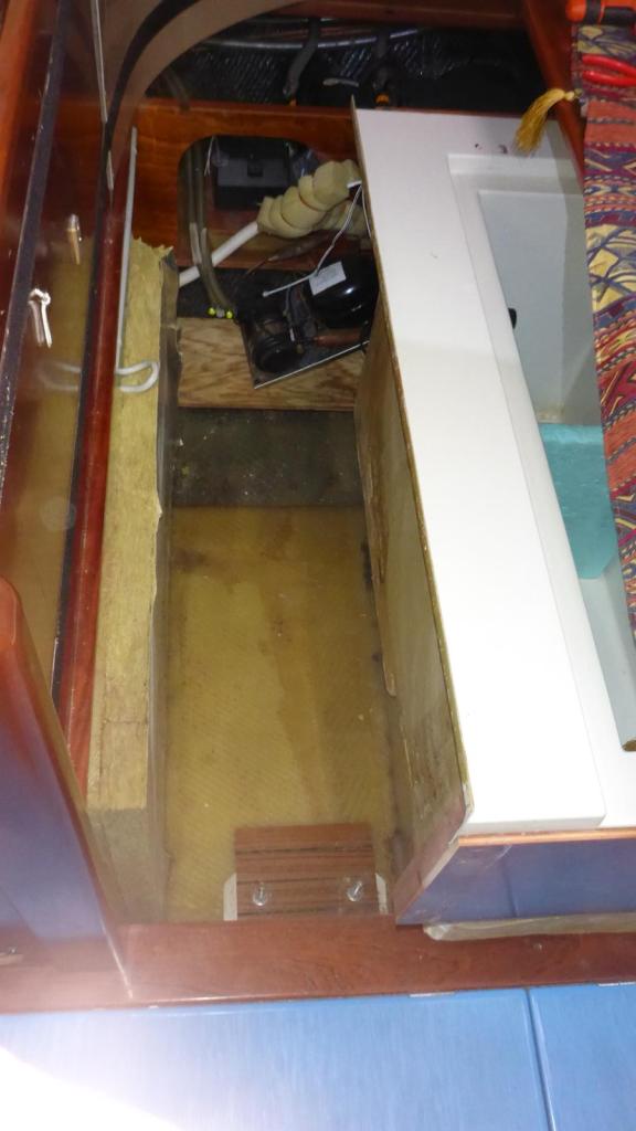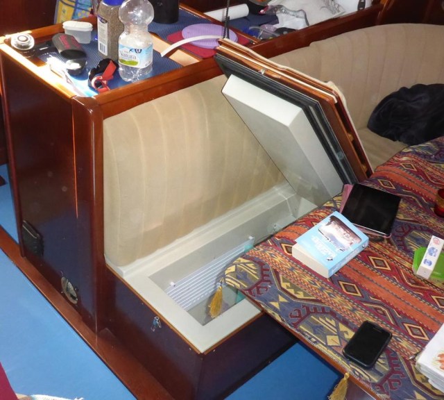 My first thought was to try to lift out the GRP fridge from the plywood sofa module, but it seems to be impossible, and it was. After many questions on the Amel Owners forum I found the solution