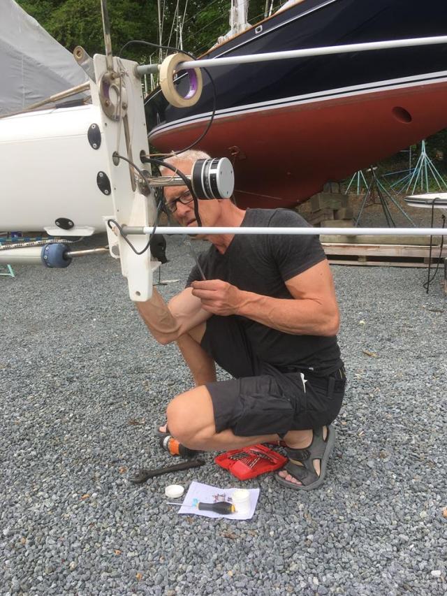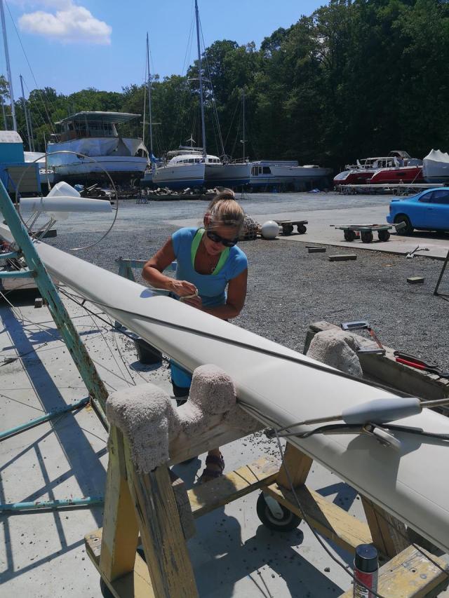 Kerstin clean and wash the mast, much easier now when the mast is down, probably a decade since it was done last time.