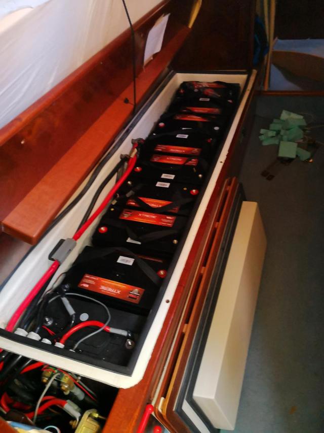 Next project was to install the new batteries 8, 34 kg batteries, the old one was 110 Ah each, the new one bought from USA but probably made in China was on 135 Ah, so we increase from 440 Ah to 540 Ah. The brand is V-max and the price for this AGM batteries was very attractive compared with other AGM batteries, at least 1000 $ lower than 8 high end group 31 AGM. The spec for the V-Max is good and have very good rating from the one who bought them from Amazon. Next time we change it will be LiFePO4 batteries.
