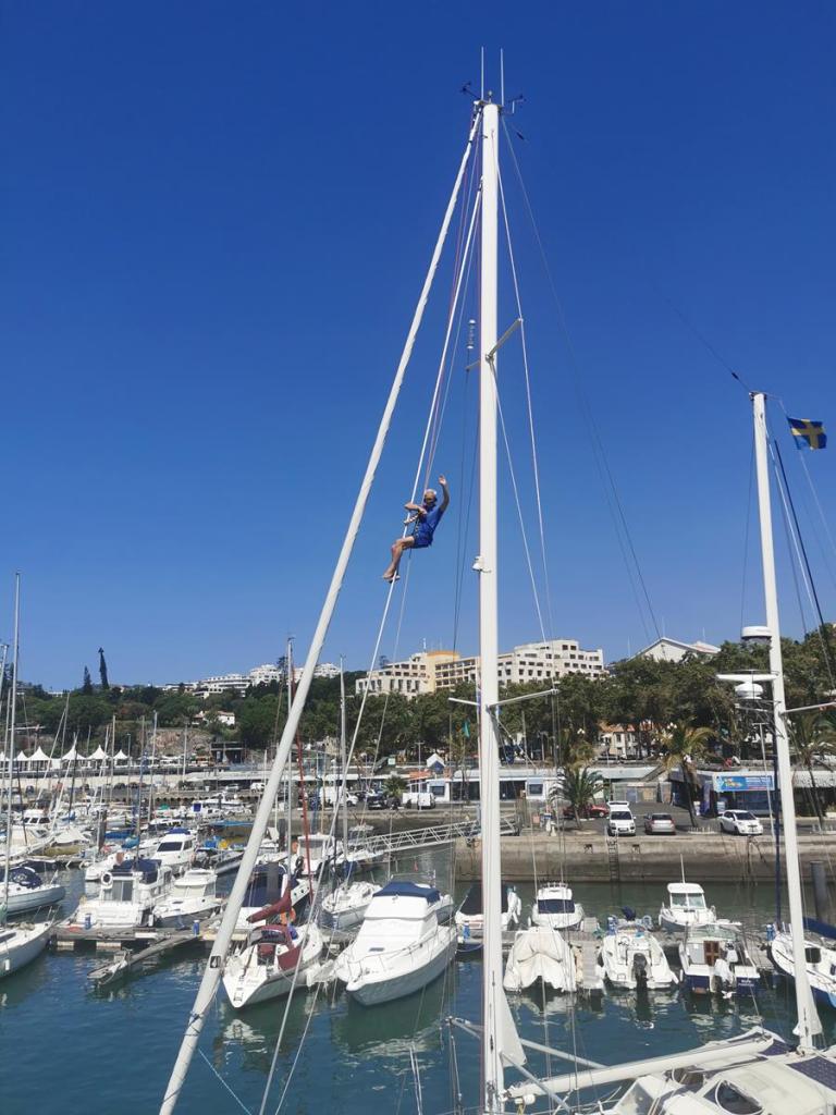 It took a full week for them, take down the mast, undress the mast, make new wires, dress the mast, step the masts, and finally tune the rig. It was only short moments we were at the quay, most of the time we were at anchor. One thing is for sure the boat rolls substantially more without the masts on. Not fun at all to be at anchor without masts. We had the sails stored on deck in their bags, and one day they almost fell overboard when Kerpa started to roll violently when a reckless motorboat circled the anchorage with speed making maximum wave heights, can’t say he was a favourite that evening.