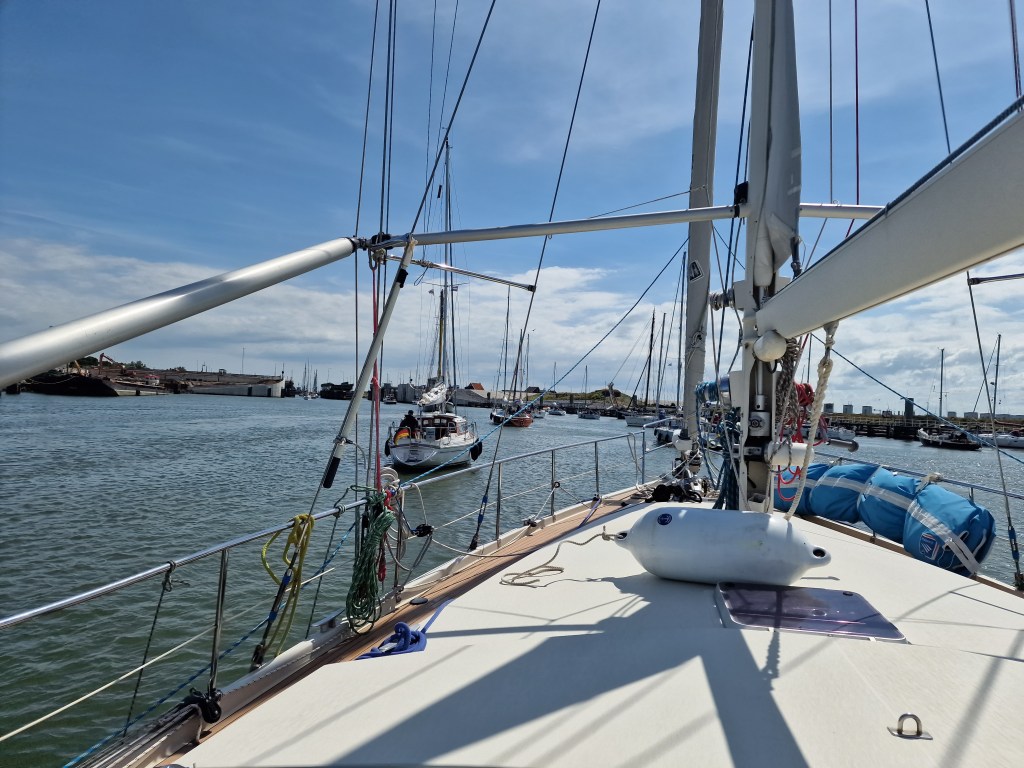 In Amsterdam my son Kristoffer with family came to visit us. After they have had a short tour of Amsterdam we set sail towards Zeebrugge, unfortunately the weather gods was not on our side, head wind +/- 20 kn and shoppy sea, made the female crew very sea sick, and about 1 hour before reaching Zeebrugge the halyard for the head sail broke so that might have been a bit scary for the crew as well, not the best start of a holiday.