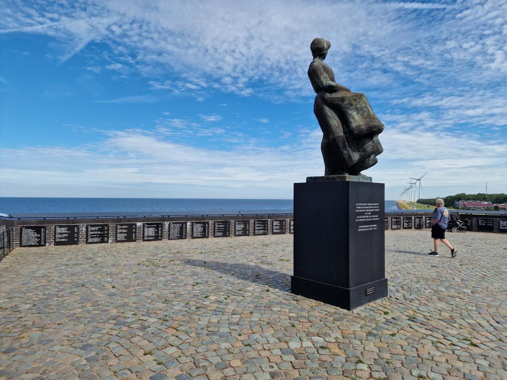 A wife and/or a mother looking for their loved one if they will came home. The text you see on the rocks in the back ground is name of the perish sea men and fishermen over the years.