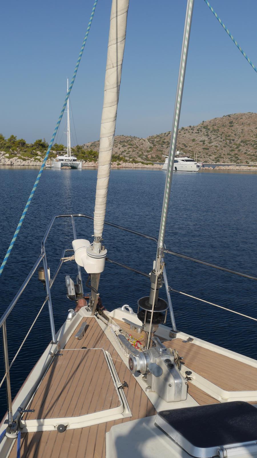 Tänk dig en sen kväll någon timma innan solen går ner, viken du valt är vacker men många båtar som ligger ganska tätt, framförallt där det är rimligt djup för att ankra. Du ser en lucka där borde det gå att ligga, men vid närmare eftertanke vinden har vridit sig flera ggr under dagen, så du har ingen aning om var de andras ankare ligger, någon kanske kom helt nyligen andra har legat i flera dagar och snurrat runt, det har hänt oss flera ggr att då vi vaknat och skall ta morgondoppet så syns vårt eget ankare strax nedanför vår akter. Med andra ord så är det svårt att hitta en bra plats och det känns oprofessionellt att lägga sitt ankare så illa att man slår ihop med någon då vinden vänder, eller ännu värre lägga sin kätting kors med någon annan. Så vår strategi är att ha långt avstånd till andra båtar, det blir ibland att ankra på lite djupare vatten än önskvärt, eller risken att komma nära land eller grund om vinden skulle vända mot ett oväntat håll. Så efter ett par försök så har vi fått vårt fäste, backat fast ankaret ordentligt, korkat upp en flaska vin i skymningen, då kommer det ganska ofta en charterbåt, de identifierar snabbt den luckan som jag inte vågade använda lägger ankaret utan vidare funderande och utan att backa fast sitt ankare sedan fram med groggen, därefter kommer det en till och lägger sig på en ur vår synvinkel ännu olämpligare plats också utan att backa fast ankaret. I början så tänkte jag, att det kommer inte att funka, de kommer att dragga, slå ihop med någon annan båt. Nu vet jag bättre, oftast (men inte alltid) går det alldeles utmärkt för dem, de varken draggar eller slår ihop med någon annan trots att vinden både vänder och friskar i, vi som valt en annan strategi får ibland obehagliga överraskningar sällan att vi draggar, men att vinden kommer ifrån ett oväntat håll och vi kommer för nära klippor för att det skall kännas bekvämt. Livet är inte RÄTVIST.