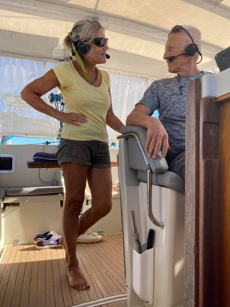 Us with our head set a very good tool when communicating over longer distances, now we are discussing how to set the Code sail. Must say we will be very pleased with the sail very easy to set, furl and unfurl, very versatile we have tried it from 80 degree to 170 degree apparent wind angle works great, sure it will be a good sail for our future trips. Now we are waiting to be hauled out at Sopromar in Lagos, I have ordered prismatic cells to convert to lithium 16×270 Ah cells all in all 540 Ah 24v. Guess we will have busy times with maintenance and improvements for out next trip.