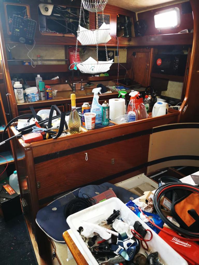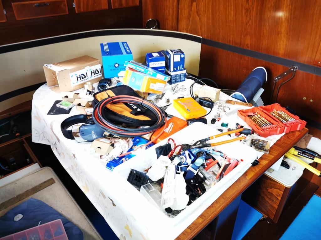 While I work on the engine Kerstin is cleaning out our drawers, they are lined with some white fluffy fabric, smart solution? Not sure, the fabric stop noise from things rattling around in the drawers but as the fabric is glued fast, it is extremely hard to clean. Kerstin has a hard work cleaning the drawers and restore the waterproofness of our cockpit enclosure