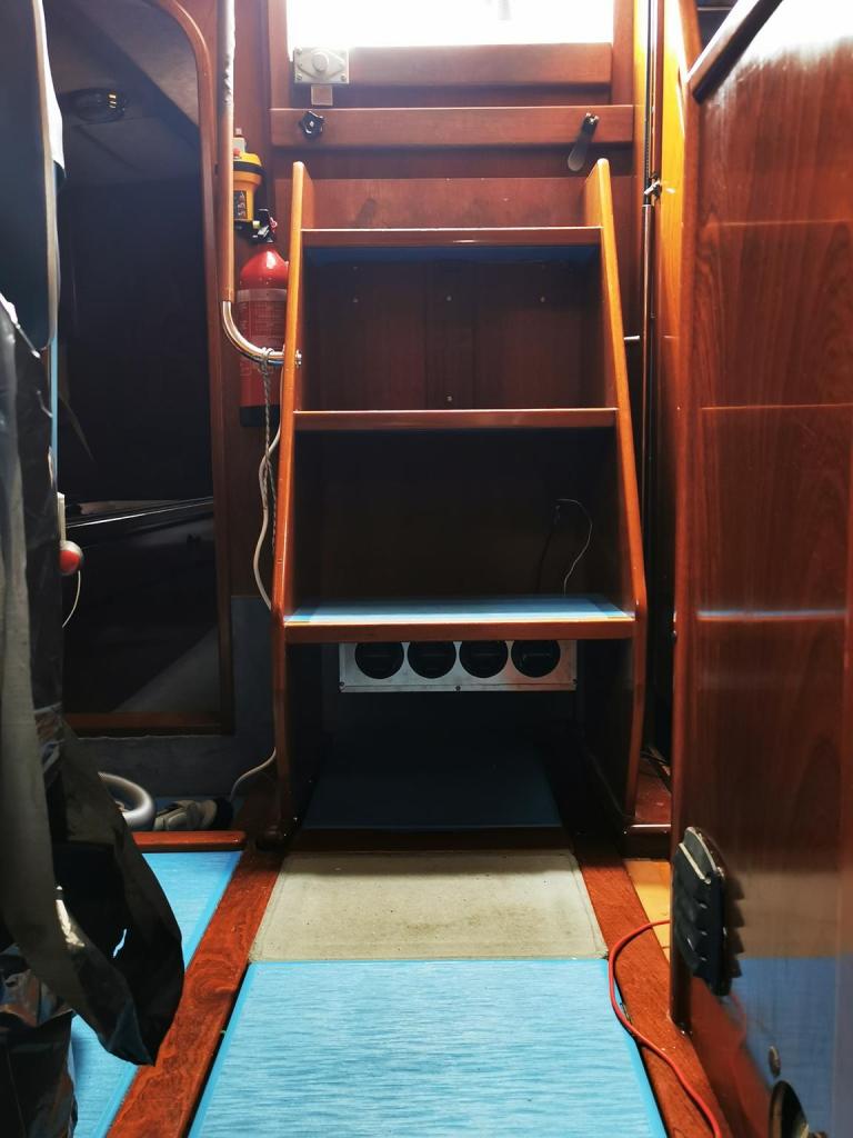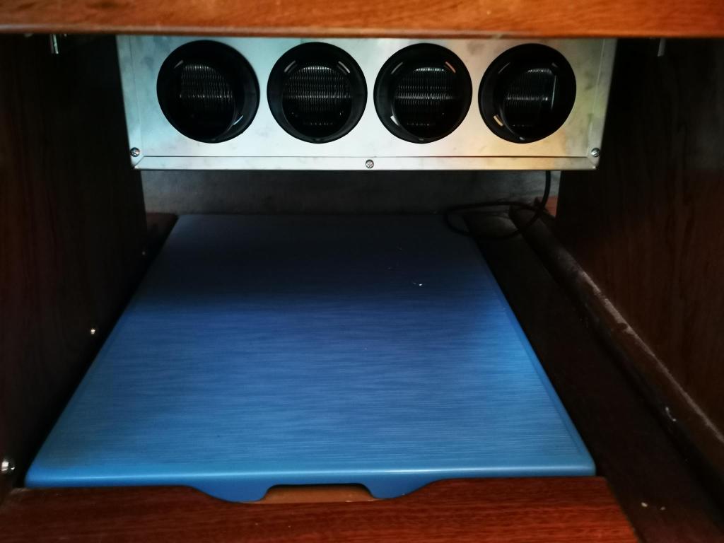 above you see the warm air outlet just above the outlet for the air-conditioner. Amel had already installed a duct from the cockpit locker to the fore cabin so that came in handy. The heater together with new soft carpets make it very cosy aboard