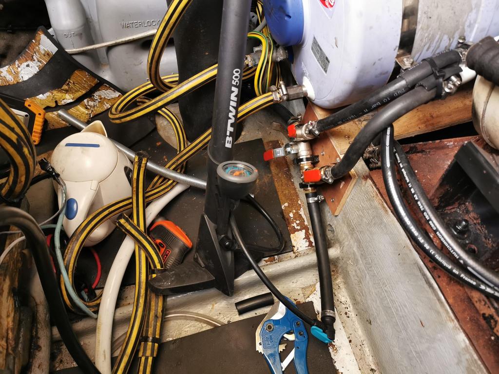 the hot water from the engine first pas the boiler for domestic hot-water, then to the heat exchanger for the cabin. The cabin heat exchanger can easily be isolated by two bal-valves in case any trouble occur in the installation, not to jeopardize the ability to run the engine, again I used my bicycle pump to pressure-test the whole system