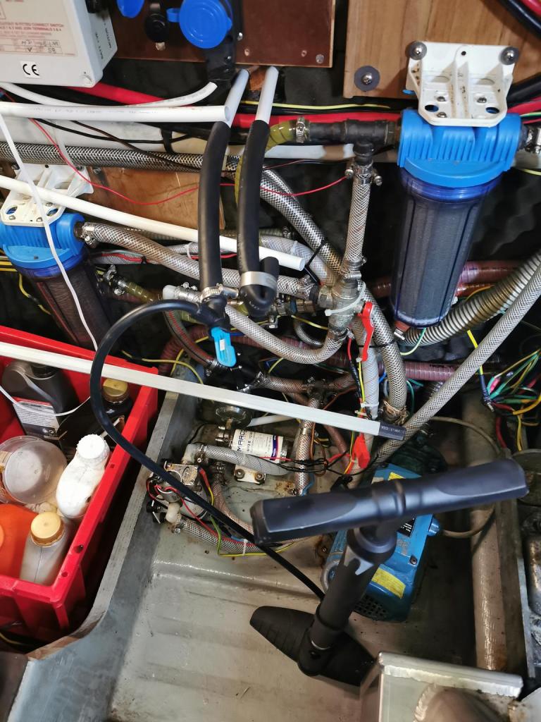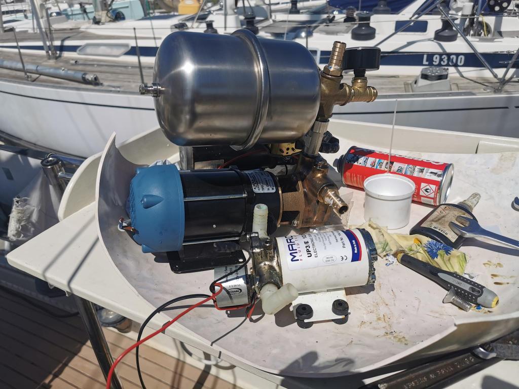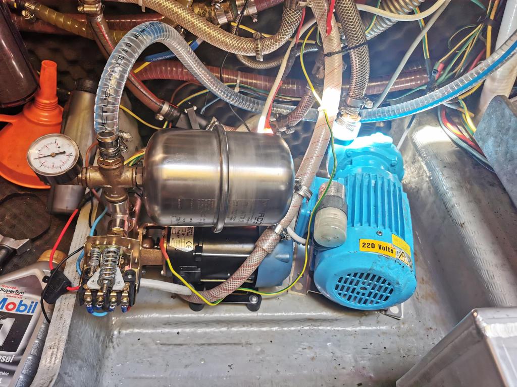There is a huge difference in size in favour of the “old” Marco, which work with variable speed and should not need any accumulator tank, but I’m already in to the second one I a few years so went back to the original Amel set up, I had both a spare pump and a spare motor so decision was easy.