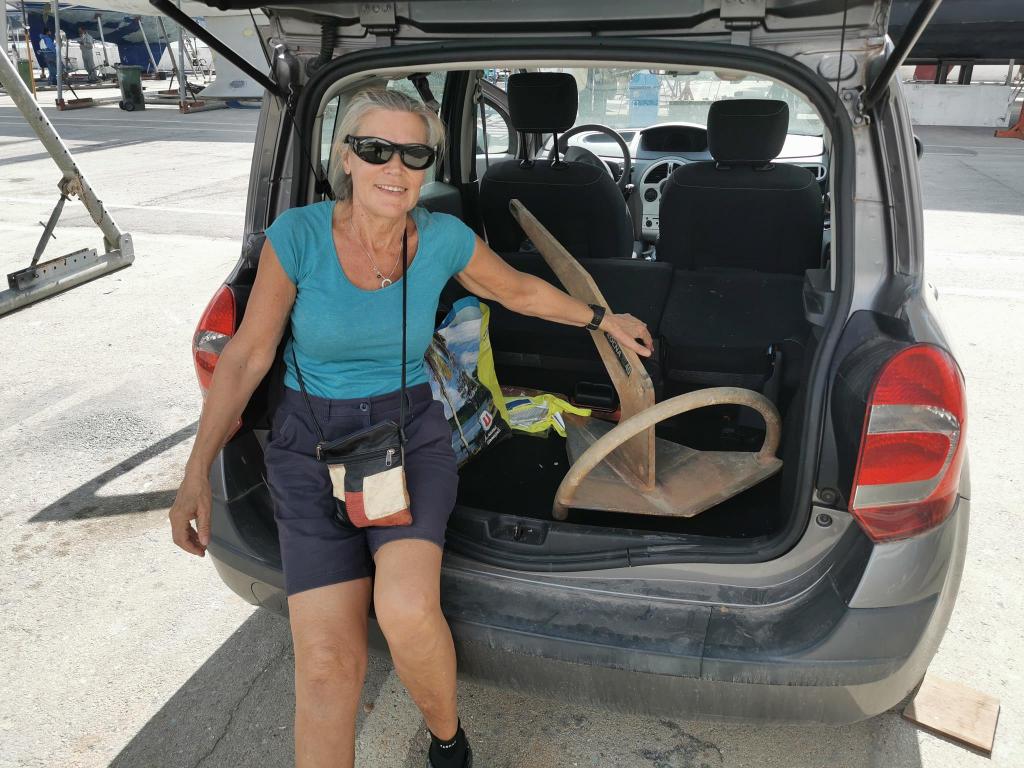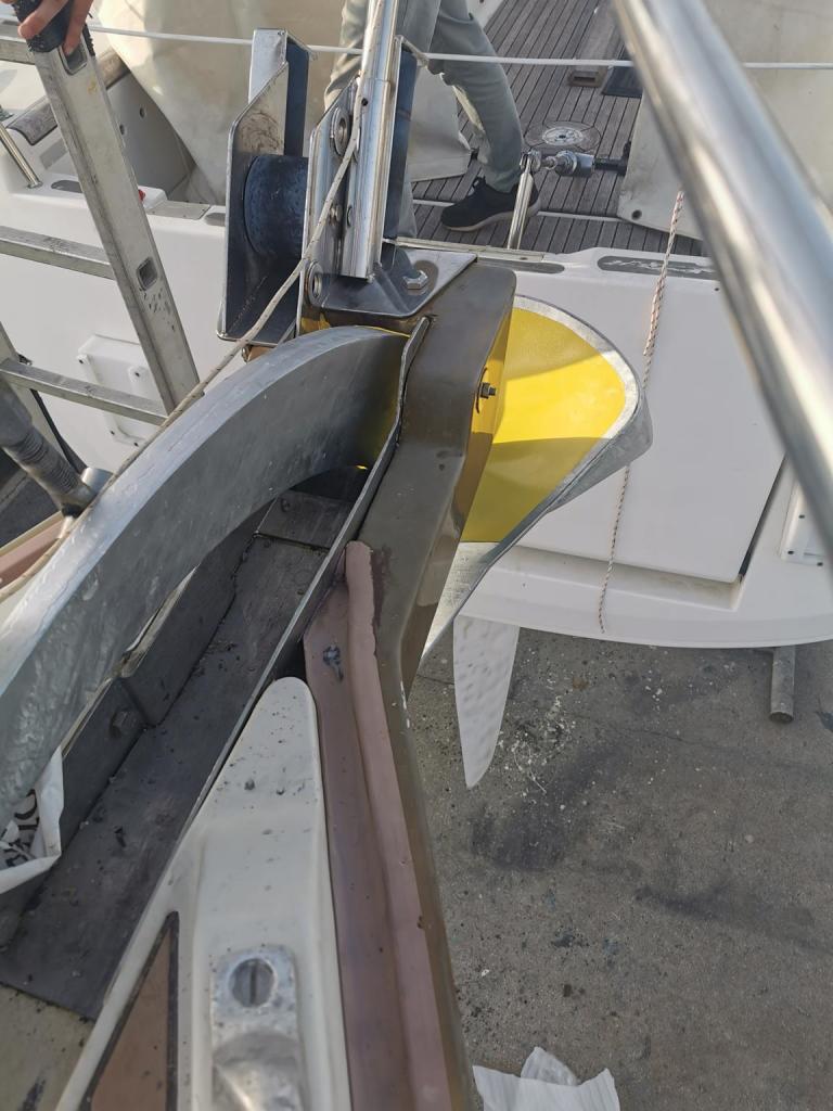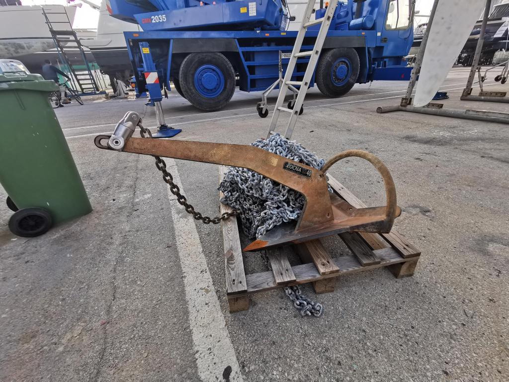It is a rather big beast of anchor weigh 40 kg, one see it when in the car both, it has been replaced with a 45 kg Spade, and that after a lot of research on the internet for a more reliable anchor. Theed 45 kg Spade anchor fits very well on the anchor roller, no amendments needed.